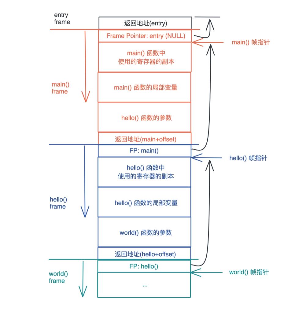 栈自顶向下增长。一个程序的调用栈最底部,除去入口帧 ( entry frame ) ,就是 main() 函数对应的帧,随着 main() 函数的一层层调用,栈会一层层扩展;调用结束,栈会一层层回溯,释放内存。